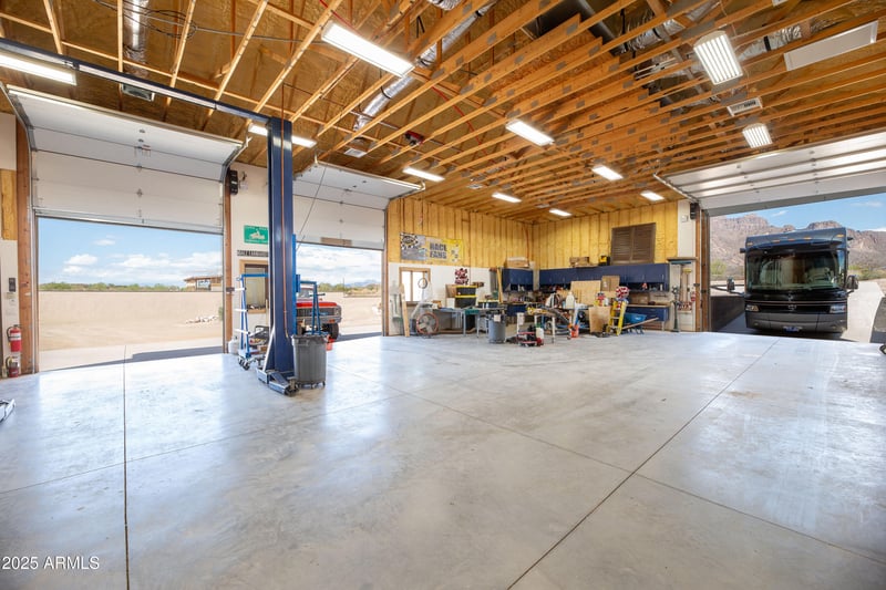 construction multi-car garage, with incredible Superstition Mountain views. This RARE gem is a dream for all car buffs, entertainers, and more! Bring all your toys -there's room as it is designed to also store a 42' MotorCoach. Fully insulated and air-conditioned with RV doors, air compressor lines, car lift, bathroom, ample storage. Ideal for all your projects and toys. You can't build this for the price!