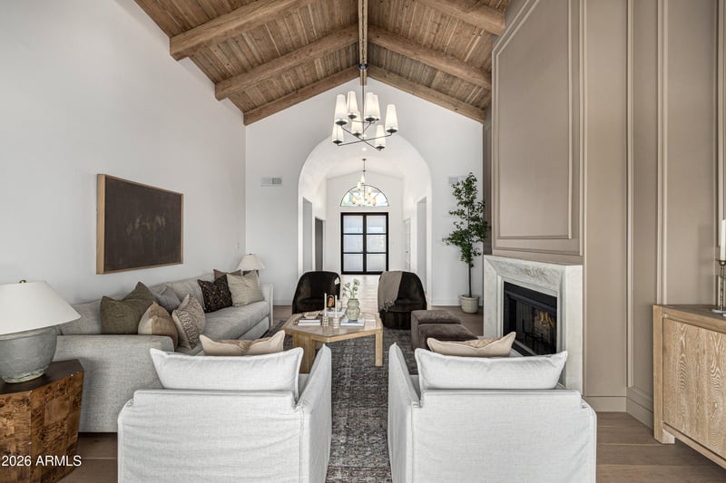 Listing details for 15341 Verbena Dr, Fountain Hills, AZ 85268 : Private hillside retreat with stunning mountain views and a resort-style backyard featuring a pool, spa, and multiple entertaining areas designed to capture the surrounding desert landscape. Inside, the home showcases high-end finishes throughout, including White Lux 3cm natural stone quartzite in the kitchen and pantry with a waterfall-edge island, custom cabinetry, and skylights that fill the space with natural light. Mont Blanc quartzite carries through the laundry, guest bath, and primary suite for a cohesive luxury feel. The primary suite offers a true spa experience with a private in-home sauna and tranquil backyard views. Additional highlights include vaulted ceilings, updated tile flooring, dual AC units, and seamless indoor-outdoor living designed for year-round enjoyment.