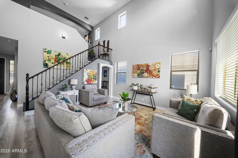 Listing details for 15353 Jefferson St, Goodyear, AZ 85338 : Spacious 4-bedroom, 3-bath home in the desirable Centerra community of Goodyear offering over 3,100 sq ft of living space. This two-story home features multiple living areas including a family room, formal dining, and a versatile bonus/game room. The updated kitchen offers granite countertops, a pantry, breakfast bar, and eat-in dining area.