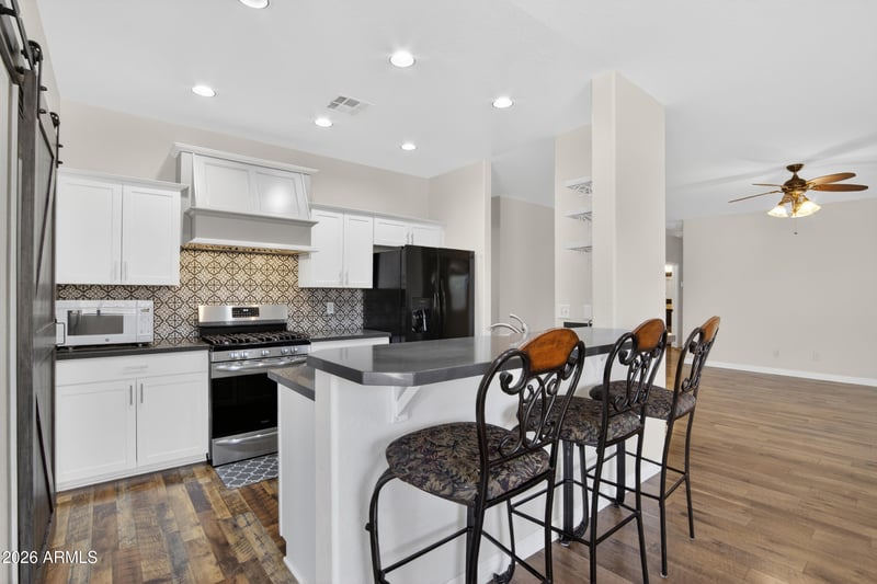 Listing details for 15402 169th Ave, Surprise, AZ 85388 : Charming single-story corner-lot home with 3 beds, 2 baths, plus a rare 3-car garage. Bright, open great-room floorplan with tasteful updates and an easy flow for entertaining. Remodeled kitchen features quartz countertops, tile backsplash, gas range, refrigerator, and a barn-door entry to a walk-in pantry and adjoining laundry room. Both bathrooms have been updated and the home has been meticulously maintained. Beautiful wood laminate flooring throughout, with carpet only in the two secondary bedrooms.