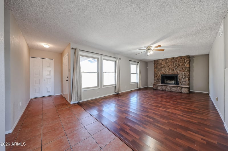 Listing details for 15402 56th Ave, Glendale, AZ 85306 : Fresh interior paint and brand-new carpet give this Glendale home a clean, move-in ready feel. Inside, you'll find a spacious living area anchored by a striking floor-to-ceiling stone fireplace and warm wood-look flooring. The galley kitchen offers generous cabinet storage, tile floors, and a bright layout that flows easily into the main living spaces. Windows replaced approximately five years ago add efficiency and natural light throughout. New AC installed 2022. Step outside to a backyard built for Arizona living, complete with a private pool with newer pool pump (2023), extended patio space, and room to create your ideal outdoor retreat.