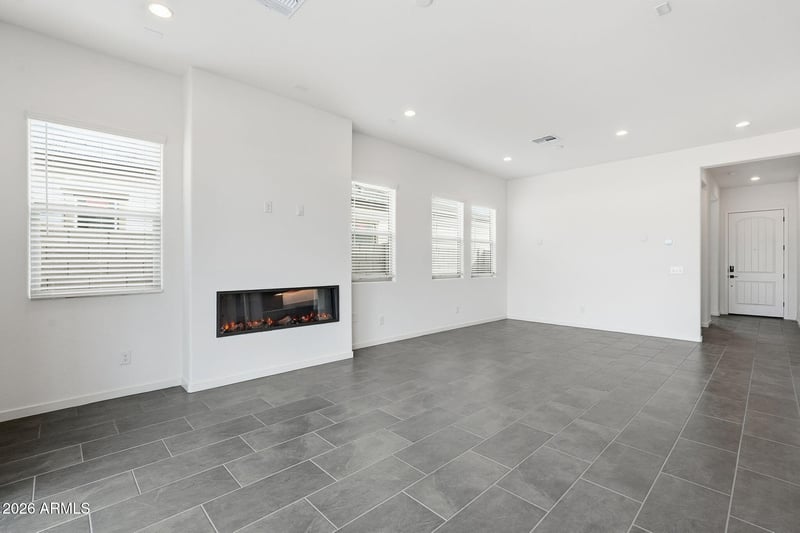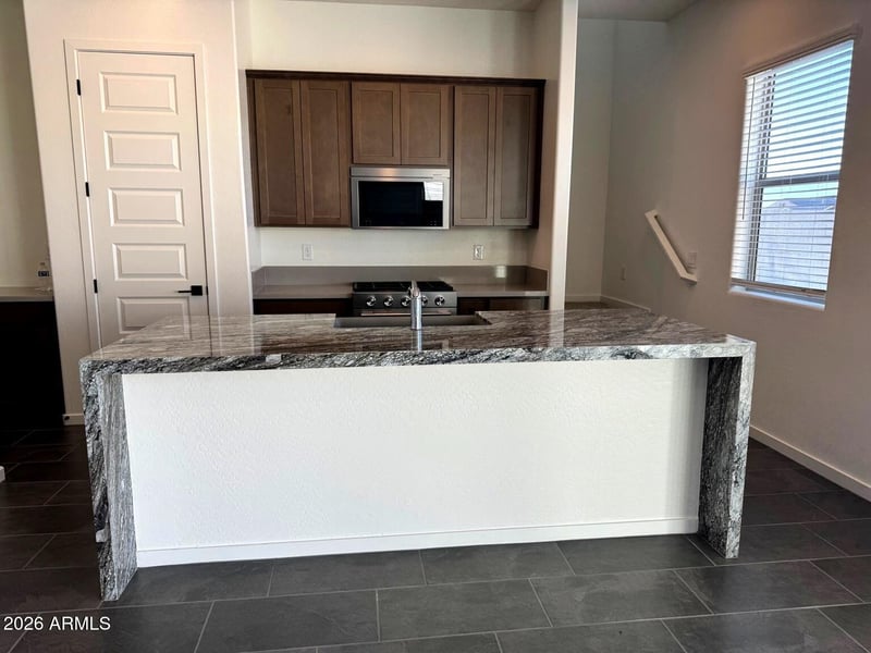 The great room is anchored by a stunning fireplace and opens to the outdoors through a 12-foot multi-slider pocketing door—creating seamless indoor-outdoor living ideal for entertaining or relaxing on Arizona evenings. The elegant Spanish-style exterior adds timeless curb appeal. The kitchen shines with granite countertops, a dramatic waterfall-edge island, and premium KitchenAid appliances, blending modern luxury with everyday function. Upstairs, the primary suite features an oversized walk-in closet.