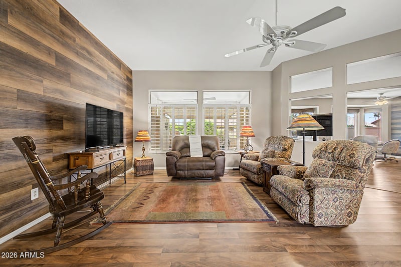 Listing details for 15523 Ballad Dr, Sun City West, AZ 85375 : This fully updated and popular Safford model features a new roof (2023) and HVAC system (2023). LVP flooring runs throughout, with carpet in the bedrooms. Both bathrooms are updated, and the guest room includes a Murphy bed. An enclosed flex room is perfect for crafts or a home office. The kitchen boasts newer maple cabinetry, granite countertops, and a center island with storage. Outside, enjoy an extended covered patio with a built-in BBQ, water feature, and fruit trees. Offered as a turnkey home, this is truly a must-see to appreciate.