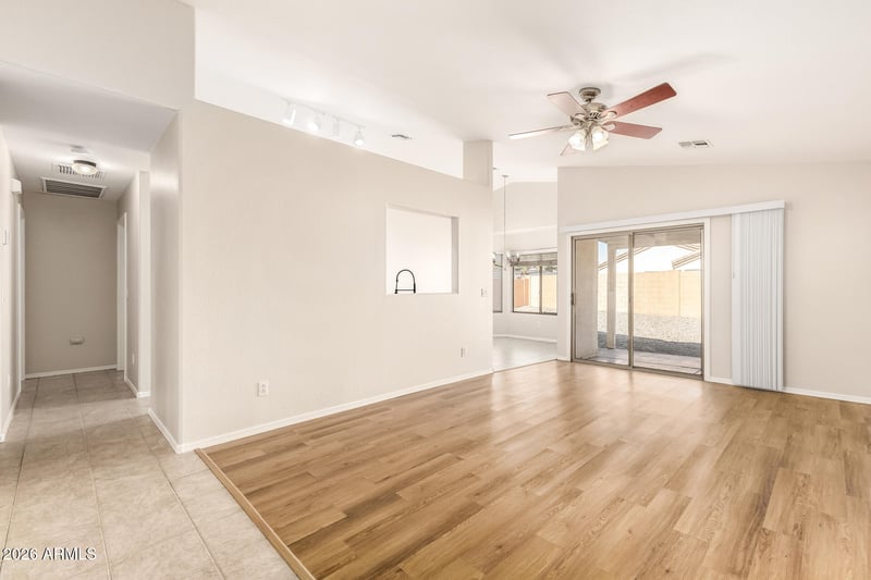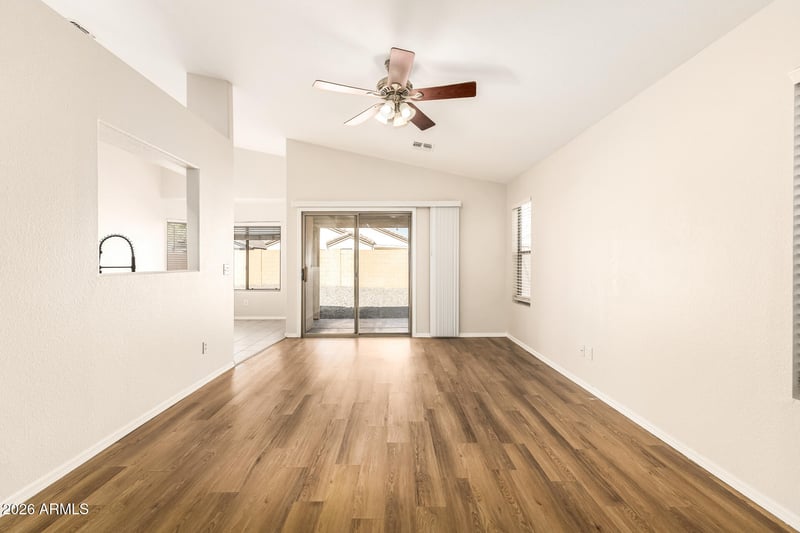 Listing details for 15526 Lisbon Ln, Surprise, AZ 85379 : Enjoy convenient living in this charming single-story home that has been newly renovated! Freshly painted interior features a large living room with wood-look flooring, neutral tone, vaulted ceilings, and sliding glass doors that open to the back patio for effortless indoor-outdoor living. Renewed kitchen comes with white cabinets, stainless steel appliances, sleek quartz counters, and a dining area with a lovely bay window. Venture to the airy primary bedroom offering plush carpet, direct outdoor access, a private bathroom with a soaking tub, and a walk-in closet. The secondary bedrooms include six-panel door closets. As a bonus, a washer and dryer convey. Don't miss the spacious backyard with a covered patio, where you can sit back and relax. This rare find won't last!