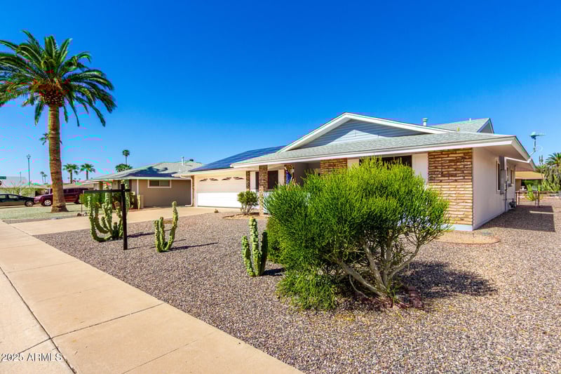 Experience vibrant adult living in Sun City! This lovely 2-bedroom, 2-bath home welcomes you with a 2-car garage, a low-maintenance desert landscape, and an inviting front patio. Inside, you'll find a serene living room with a warm palette, tile flooring, and built-in shelves. The kitchen comes with tile counters and backsplash, built-in appliances, and a handy pantry. The main bedroom features convenient patio access, a make-up vanity, a private bathroom, and a walk-in closet. You'll also find a spacious sunroom, the perfect spot for enjoying the warm Arizona weather year-round. The large laundry room also provides space for extra storage. Venture out onto the sizeable backyard, complete with an open patio and a couple of citrus trees.
