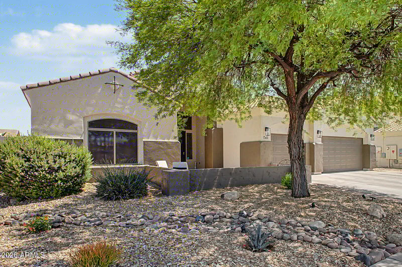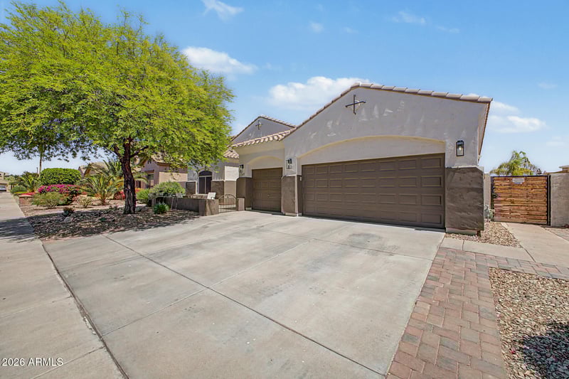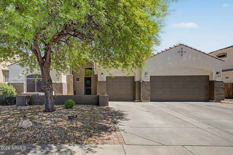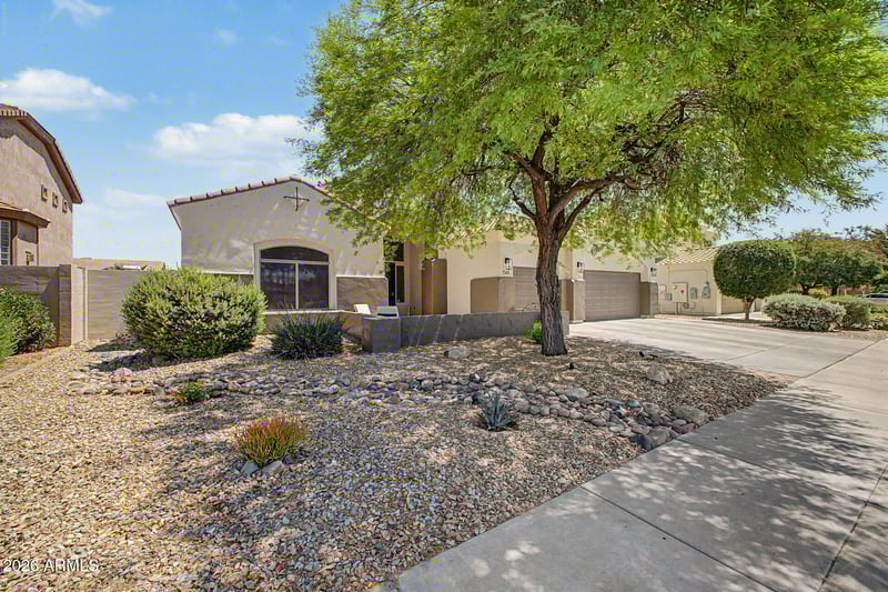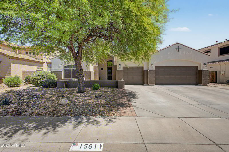 Listing details for 15611 176th Ln, Surprise, AZ 85388 : Home, sweet home! This delightful 3-bedroom residence welcomes you with a 3-car garage and a front patio that sets an inviting tone. The whole interior and exterior of this home have recently been painted. The interior is a soft sage (photos are deceiving) Fall in love with the captivating living room featuring high ceilings, recessed lighting, plantation shutters, and attractive wood-look flooring. The stunning kitchen comes with quartz counters, crisp white cabinetry, upgraded Viking 5 burner gas range, stainless steel appliances, a pantry, and an island with a breakfast bar. You'll also find a versatile den ideal for an office or study. The primary bedroom showcases a convenient backyard access, an ensuite with dual sinks, a soaking tub, and a walk-in closet. So many upgrades!! Imagine enchanting evenings in the gorgeous backyard, boasting a covered patio, lovely gazebos, travertine pavers, and a sparkling pool for cooling down on hot summer days. Make this incredible gem yours!