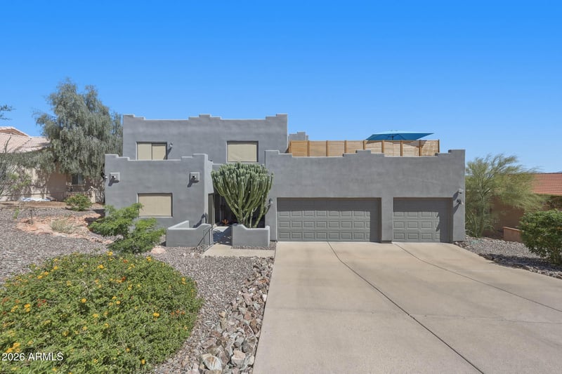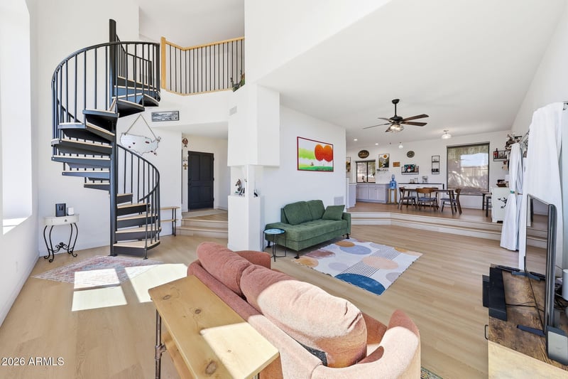 Listing details for 15620 Thistle Dr, Fountain Hills, AZ 85268 : Discover a one-of-a-kind desert retreat in the heart of Fountain Hills, where bold architecture meets breathtaking Sonoran Desert views. This 4-bedroom, 4-bath custom residence stuns with soaring ceilings and a dramatic two-story living room framed by 10-foot windows showcasing hawks gliding over the desert ravine and distant mountain views. Host star-lit evenings on your spacious 30' x 20' rooftop deck. Enjoy quiet moments from the private balcony, patio, or deck connected to every bedroom. Three bedrooms feature en suite baths for ultimate comfort. A striking spiral staircase makes a lasting impression, while over $150,000 in upgrades--including newer AC, fresh stucco, updated walk deck, and LVP flooring throughout--deliver peace of mind. No HOA. Just elevated, effortless desert living.