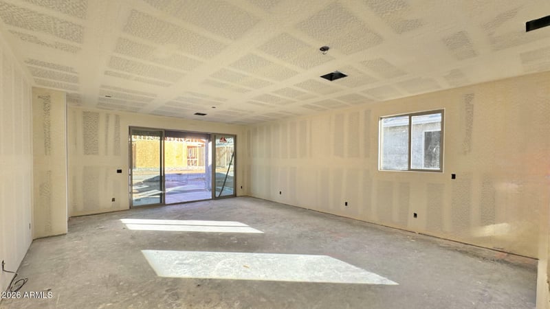Designed with volume and openness in mind, the home features 9-foot ceilings and 8-foot interior doors throughout. The great room extends effortlessly to the backyard through a 4-panel center sliding glass door, creating a seamless indoor-outdoor connection ideal for Arizona living.