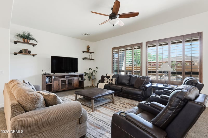 Listing details for 15725 Berkeley Rd, Goodyear, AZ 85395 : Perfect for winter visitors, this beautifully maintained 2,700 sq ft home in Goodyear offers space, comfort, and easy Arizona living. Set on a spacious lot with a 3-car garage and RV gate—ideal for seasonal living. A charming courtyard entry leads to a bright, open layout with 3 bedrooms plus an office/den, 2.5 baths, while enjoying the winter months. The kitchen offers generous storage and seating and flows seamlessly into the great room and dining areas, ideal for entertaining guests or relaxed everyday living. Enjoy the best of Arizona winters with nearby golf courses, parks, lakes, mountain views, and easy access to shopping, dining, and top-rated schools—a perfect lock-and-leave or seasonal retreat.