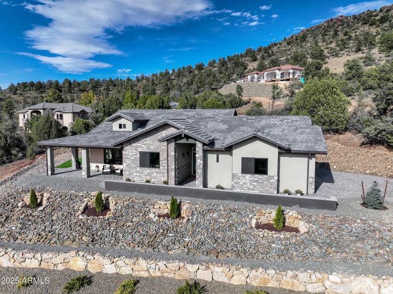 Listing details for 1580 Southview Dr, Prescott, AZ 86305 : New Custom Modern Ranch with Sweeping 180° Mountain Views! Perched on a knoll with level driveway, this stunning home captures panoramic VIEWS! VIEWS! VIEWS! of Thumb Butte & Granite Mountain range. Designed for today's lifestyle, home features an open, spacious great room concept with luxury chef's kitchen showcasing quartz countertops, large island, gas cooktop, stainless appliances & modern lighting throughout. Interior highlights: LVP, tile flooring, designer FP wall with black-faced 24'' x 48'' tiles, luxurious primary suite, walk-in shower, garden tub & dual vanities. Sleek hardware to the modern fixtures reflects refined craftsmanship & contemporary style. Enjoy outdoor living on the surrounding covered patio while taking in breathtaking views, artificial turf & 3-car garage