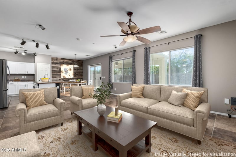 Listing details for 15820 164th Ln, Surprise, AZ 85388 : You'll love this open-concept 4-BR, all-tile home with charming details throughout. The bright white kitchen features faux-stone countertops with rough-hewn edges that complement the earth-tone tile flooring. A large island and breakfast bar overlook the pool and spacious great room, while the dining area is highlighted by a striking wood accent wall. From the kitchen and great room, enjoy views of the fully fenced backyard with a sparkling pool, pergola, and always-green artificial turf. The spacious primary suite is privately separated and includes a large walk-in closet with ample shelving. The primary bath offers dual sinks and a private toilet room. All bedrooms have ceiling fans, and the backyard features a gas fire pit. Check out the large workroom off the garage!