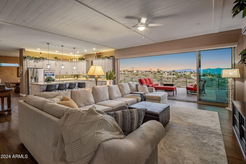 Listing details for 15848 Palomino Blvd, Fountain Hills, AZ 85268 : This is the tri-fecta: An elegant 2022-built home, big mountain views, a 1300' guest residence AND a 10-car garage. On the main level, massive views of Four Peaks Mtn and 3 mountain ranges from the great room, bar & island kitchen, with 20' of glass sliders out to a 18x70' deck perfect for entertaining. A crowd-size dining room features storage for all your treasures. There are 3 suited bedrooms plus a den. Primary suite offers views, spa like bath and large closet. A 2-car garage upstairs, but downstairs a pull-through 8-car garage, shop and 1300' casita with living room & kitchen. The home was exceptionally built with high-efficiency foam insulation, solar power and mini splits allow each room to be individually controlled. Ask about pool option! Casita Furniture included. NO HOA