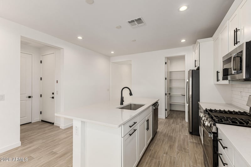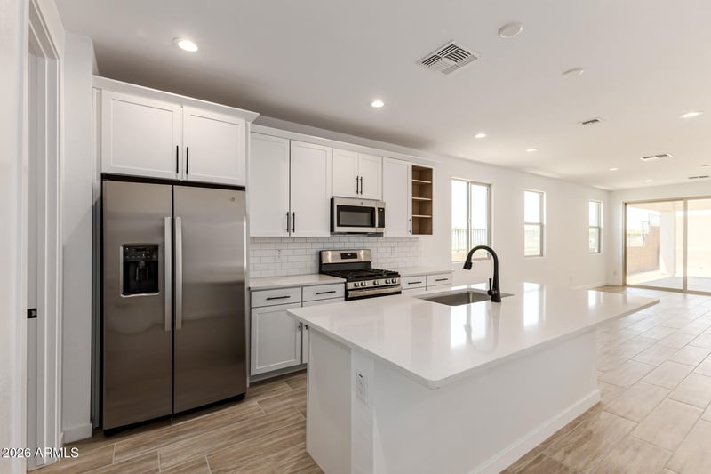 Listing details for 15850 Vogel Ave, Goodyear, AZ 85338 : Explore this thoughtfully designed Sunstone floorplan featuring 3 bedrooms and 2 bathrooms. This home includes a study and teen room with a functional open layout. The kitchen features a gas stove, quartz countertops, stainless steel appliances, 42'' upper cabinets, a tile backsplash, and a walk-in pantry. The spacious primary suite includes dual walk-in closets, dual sinks, and a separate water closet in the bathroom. Additional features include stone tile flooring, a large covered back patio, and ceiling fan prewiring in select rooms.