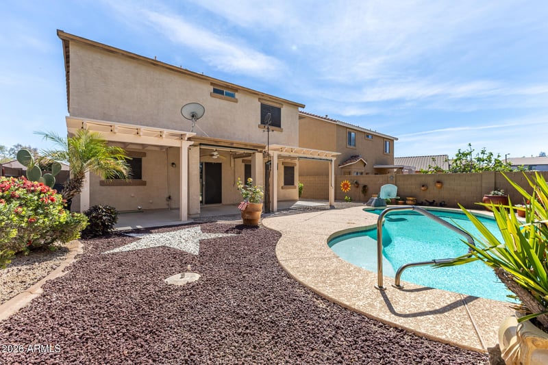 The backyard offers excellent privacy, backing to a greenbelt with no rear neighbors, and features a covered patio, low-maintenance landscaping, and a pool.