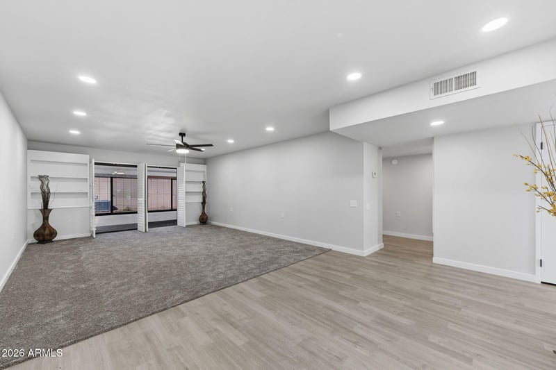Listing details for 160 Leisure World -- #160, Mesa, AZ 85206 : Ideally situated on a corner lot, this stunning home has undergone an approximate $50,000 renovation and is truly move-in ready. Thoughtful upgrades shine throughout, including LVP flooring and carpet, plantation shutters, and beautifully upgraded bathrooms. The primary suite is a standout, featuring a double vanity, two closets with built-in shelving, a stylish accent wall, and direct access to the Arizona room. The Arizona room, complete with its own AC unit, is filled with windows and blinds, creating a bright and versatile space to relax or entertain year-round. The kitchen offers stainless steel appliances and a large window that floods the space with natural light, while the living room includes built-in shelving for both style and function. Additional highlights include a one-car oversized garage and charming citrus trees in the front yard, adding to the home's curb appeal.