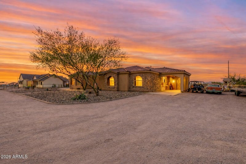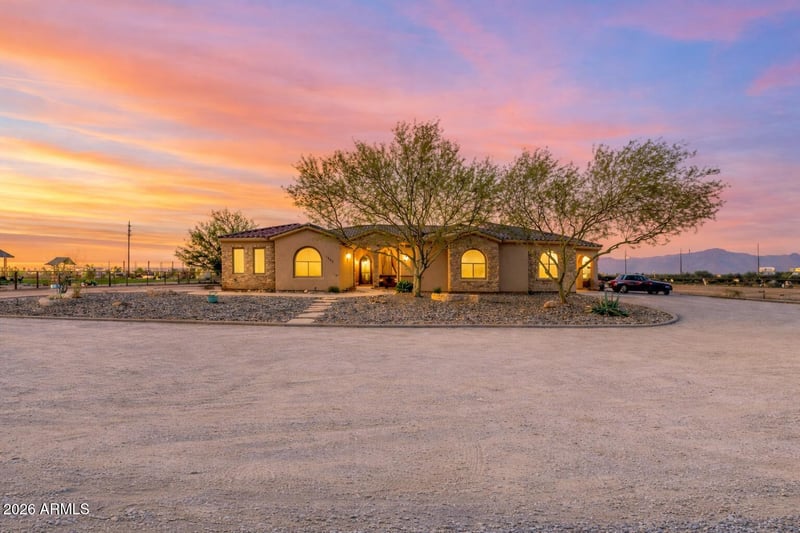 Listing details for 1602 Lobo St, San Tan Valley, AZ 85140 : Custom ranch home with NO HOA on 1.25 acres of irrigated horse property, perfectly positioned to capture breathtaking mountain views. Thoughtfully designed with a split floor plan and exceptional detail. The gourmet kitchen features custom alder cabinetry, granite countertops, walk-in pantry, breakfast bar, built-in refrigerator, and a dual-fuel range with convection oven, ideal for entertaining or everyday living. The private primary suite includes a spacious walk-in closet with additional laundry hookup, jetted soaking tub, travertine tile shower, dual vanities, and an additional closet. Secondary bedrooms are paired with a dedicated living/playroom, while the home also offers a large theater room and a separate bonus/game room (or optional dining space), providing multiple areas for entertaining, relaxing, or working from home. The fifth bedroom, located just off the primary suite, is currently used as a theater but would be ideal for a nursery or home office.