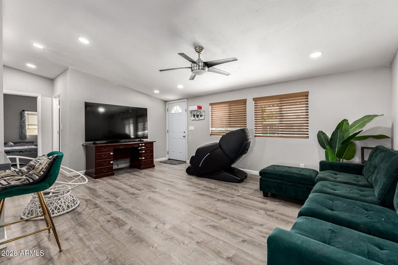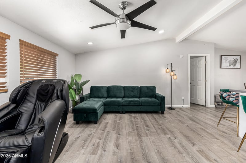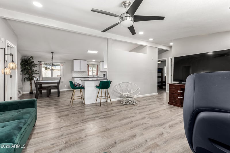 Listing details for 16021 70th Ave, Peoria, AZ 85382 : Beautifully updated ranch-style home featuring carport parking and a thoughtfully landscaped backyard designed for relaxation. Inside, enjoy wood-look laminate flooring, recessed lighting, and a spacious great room that flows into an open-concept kitchen, perfect for entertaining. The kitchen boasts white cabinetry, granite countertops, built-in appliances, and a stylish subway tile backsplash. The bright primary suite offers a large closet and an updated bath with dual vanities. Step outside to a beautifully designed backyard with a full-length covered patio and a paver seating area, ideal for relaxing evenings.