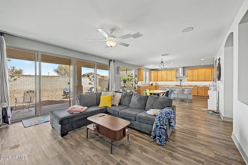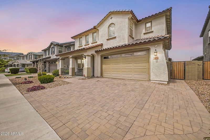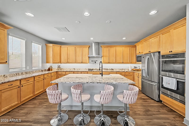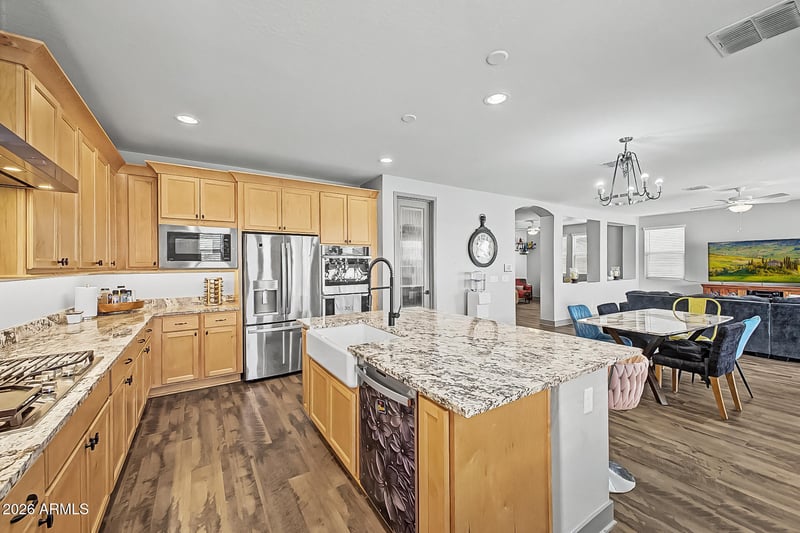 Listing details for 16076 Soft Wind Dr, Surprise, AZ 85387 : 5BR Fulton home w/ High-End Upgrades throughout! Spacious Great Room floorplan w/ tile flooring in main areas, Recessed lighting, Plantation shutters, arched passageways, neutral palette, 8 ft Doors throughout & surround sound. The Chef's Kitchen features Granite Countertops, Custom Cabinetry w/ Crown Molding, Large Island w/ breakfast bar, Pendant Lighting, & Stainless Steel WiFi-Capable Appliances including 36'' gas cooktop, 48'' built-in Smart Refrigerator, Double Ovens, microwave & Very Quiet Dishwasher. Dining area Accommodates large table. N/S facing home w/south-facing Courtyard perfect for Sunset views. Foyer entry leads to a bedroom & full bath ideal for guests or multi-gen living & a Formal office, large Upstairs Loft with very Spacious Bedrooms & Closets/Oversized soaking tub! primary suite w/ dual sinks, custom walk-in shower, private toilet room & 9x12 walk-in closet. Tandem 3-car garage w/ epoxy flooring.