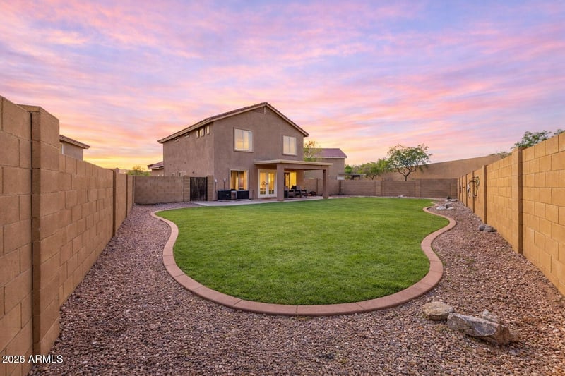 Listing details for 161 227th Ln, Buckeye, AZ 85326 : 4 bed, 3 bath Buckeye home in Sundance with 2,267 sq ft on a 9,065 sq ft pie-shaped lot near I-10 and close to Sundance and Verrado shopping. Large backyard with real grass and room to expand or add a pool. Updated kitchen features quartz countertops, backsplash, and black appliances. Flexible floor plan includes a full bedroom and bathroom downstairs, ideal for guests or multi-generational living. Located in a well-established community with convenient access to shopping, dining, and commuter routes.