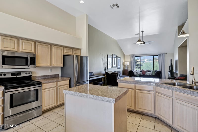 Listing details for 16107 Emerald Dr #206, Fountain Hills, AZ 85268 : Looking for the perfect winter retreat? This well maintained 1,500 sq. ft. second-level end-unit condo is ready for immediate occupancy & offers nice views of the McDowell Mtns. Soaring ceilings create a bright, open feel throughout the spacious great room, flowing seamlessly into the kitchen that features abundant cabinetry, generous counter space, island, pantry, & dining area overlooking the private balcony/patio. The split-bedroom floor plan provides exceptional privacy for you & your guests. The primary suite includes double vanities, a walk-in shower, & a large walk-in closet. Thoughtful upgrades, including double windows for added soundproofing, enhance comfort. EZ access to main roads, you're just 5 minutes from downtown FH, where you can enjoy shopping, dining &local attractions.