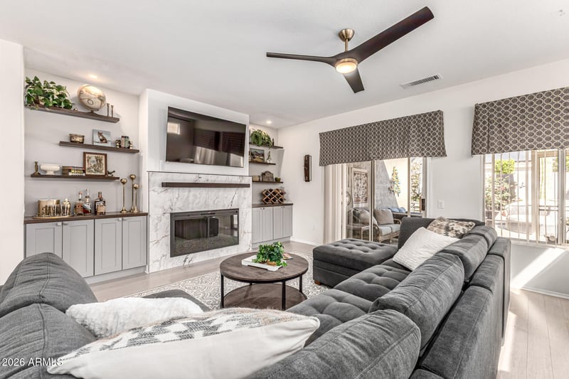 The open great room has an eye-catching accent wall with a beautifully tiled electric fireplace surround, custom cabinetry, floating shelves, and can lights. Tons of natural lighting and a sliding glass door to a screened-in patio.