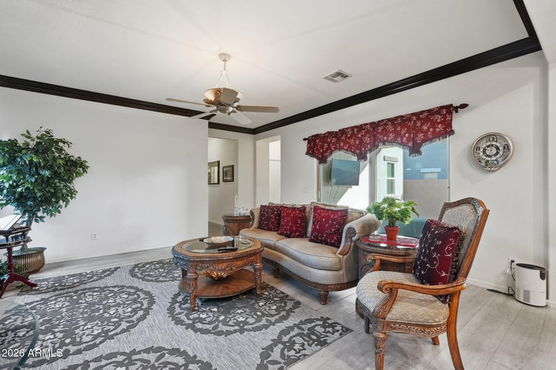 Listing details for 1616 Aryelle Rd, Apache Junction, AZ 85119 : Original Owner - Cared For With Real Pride! Mountain Views! This Standout Home Offers The Biggest Layout In Bel Agave At 1,735 Square Feet. Prime Location With Only One Neighbor And Common Area Where The Superstition Mountain Backdrop Steals The Show. Inside, The Home Feels Spacious And Elevated With 10-Foot Ceilings, Beautiful Crown Molding, And High-End Laminate Flooring In Every Room. The Split-3 Bedroom Design Creates Great Separation, And The Primary Suite Is Generously Sized. Full Primary Bath With Separate Shower And Tub. Two Walk-In Closets. The Kitchen Is Both Sharp And Practical, Featuring Tall Upper Cabinetry With Crown Detail, Stainless Steel Appliances, And A Full Pantry. Custom Extended Laundry Room. Shaded Patio Is The Perfect Place To Relax. Large Storage Shed In Back.