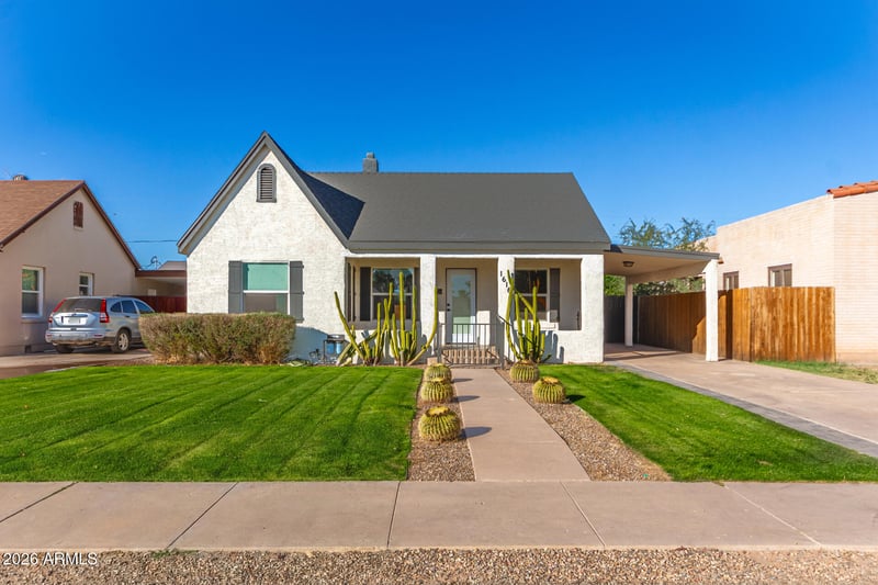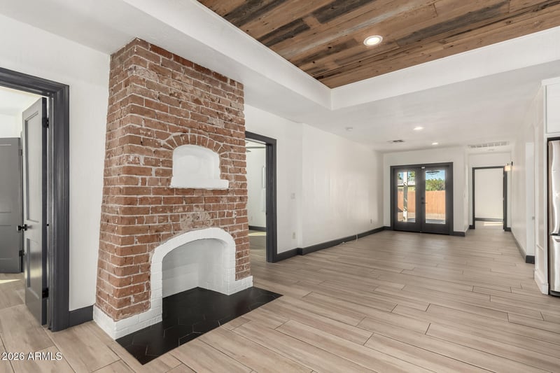 Listing details for 1616 Willetta St, Phoenix, AZ 85006 : Historic Soul. Modern Heart. Discover a masterfully reimagined 1940s treasure where vintage charm meets high-octane design. The showstopper? A culinary kitchen featuring a custom tray ceiling crafted from repurposed wood salvaged from the original carriage house...paired perfectly with sleek waterfall-edge counters and designer lighting. The vibe continues in the living room, anchored by an exposed red brick fireplace framed in striking hexagon tile for a bold, textural edge. Every inch is curated for luxury, from the wood-look floors to the primary retreat with its own private garden exit. Outside, your private oasis awaits: a fully enclosed yard with a covered patio, lush lawn, and total privacy. Located minutes from the downtown buzz, this is the ultimate turnkey urban sanctuary!