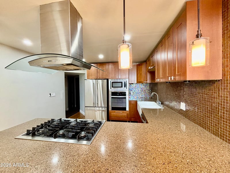Listing details for 1624 Campbell Ave #12, Phoenix, AZ 85016 : STUNNING upgraded contemporary unit offers sophisticated living in a serene, convenient location just south of bustling Camelback Corridor! The gourmet kitchen features premium granite countertops, stainless-steel French-door refrigerator, trivection oven, professional-grade gas cooktop beneath an illuminated vent hood, and modern cabinetry accented by elegant under-cabinet lighting! Recessed LED lighting and brushed-nickel, remote-controlled ceiling fans. Distinctive bamboo flooring in front rooms are complemented by sophisticated Italian tile in the remaining spaces. Bathrooms feature designer sconce lighting, contemporary wood vanities, and white porcelain vessel sinks. Spacious private patio plus community pool to relax and enjoy! Near wide array of upscale restaurants and shopping!