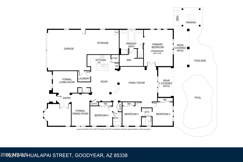 Listing details for 16245 Hualapai St, Goodyear, AZ 85338 : This stunning, move-in-ready, single-level home is fully upgraded and has paid off solar! It is perfectly located in the heart of Goodyear! This home sits on an oversized corner lot with beautiful stone elevation with 4-bedroom and 3.5-bath soaring 10-foot ceilings, an RV gate, and a beautifully upgraded chef's kitchen with granite countertops, custom backsplash, stainless steel appliances, and warm maple cabinetry. The desirable split great-room floor plan is ideal for larger households, offering a separate living room and a private den for added flexibility. The master bedroom was thoughtfully designed for a perfect private retreat area. Two of the secondary bedrooms share a convenient Jack-and-Jill bathroom. Every window has designer shutters. This home is absolutely turn-key. Step outside to your own backyard oasisfully landscaped with a huge custom pool with new pool pump just installed, cascading peaceful waterfall, expansive pavered patio with integrated sun shade, beautiful travertine, mature lemon/orange trees, upscale meticulous landscaping including pygmy date and queen palms, artificial turf, custom barbecue, two custom pergulas, custom shed approximately 10 X 6, all perfect for entertaining or relaxing. Home is very private and custom designed for extra side yard space ideal for access to bring extra toys. This exceptional home is in pristine condition and won't last longshow and sell! Buyer to verify all measurements, facts and figures.