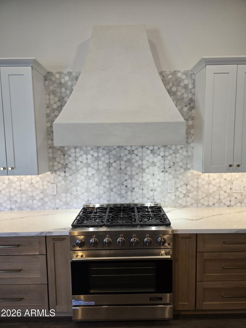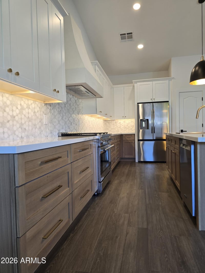 Listing details for 16253 164th Ln, Surprise, AZ 85388 : Truly one of a kind! You won't find another home like this one. The remodel is absolutely stunning, with every detail carefully designed and executed to perfection. Featuring a custom hand-crafted range hood, high-end 6 burner gas stove, quartz countertops, stainless steel appliances, and modern hardware. The bright, open concept layout flows over new engineered flooring to a beautiful handmade fireplace and a stylish mini bar with wine cooler. The nicely finished office, enclosed with elegant french glass doors, offers the perfect work from home space with plenty of natural light. The luxurious primary bath includes a soaking tub and separate glass shower. Located in a quiet neighborhood near the 303, this home stands out for its craftsmanship, quality, and modern elegance.