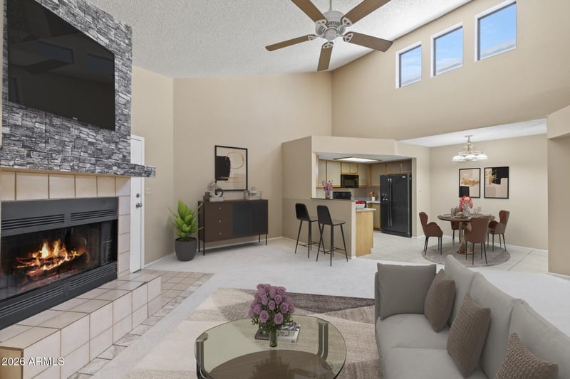 Listing details for 16402 31st St #218, Phoenix, AZ 85032 : Light, bright, and move-in ready. This well-maintained 2-bed, 2-bath, second-level condominium offers a spacious and open layout with vaulted ceilings and abundant natural light. The functional great room features a wood-burning fireplace and opens to a private balcony through French doors, creating an easy indoor-outdoor flow. 2026 updates include new carpet, fresh interior paint, and a new washer, making the home clean and move-in ready. The eat-in kitchen offers ample cabinetry, dual sinks, and full appliance package including refrigerator, range, dishwasher, and built-in microwave. Each bedroom includes its own full bathroom, providing privacy and flexibility. Additional highlights include ceiling fans, a laundry room located off the balcony with washer/dryer included, plus extra storage, and assigned covered parking. Major systems have been thoughtfully maintained with a newer HVAC system and water heater, and new roof offering added peace of mind to the next owner. Located in the Villa Capri community where residents enjoy a large community pool, sport court, barbecue grills, and low property taxes, all with convenient access to the SR-51, Loop 101, shopping, and dining. Ideal as a primary residence or investment opportunity.