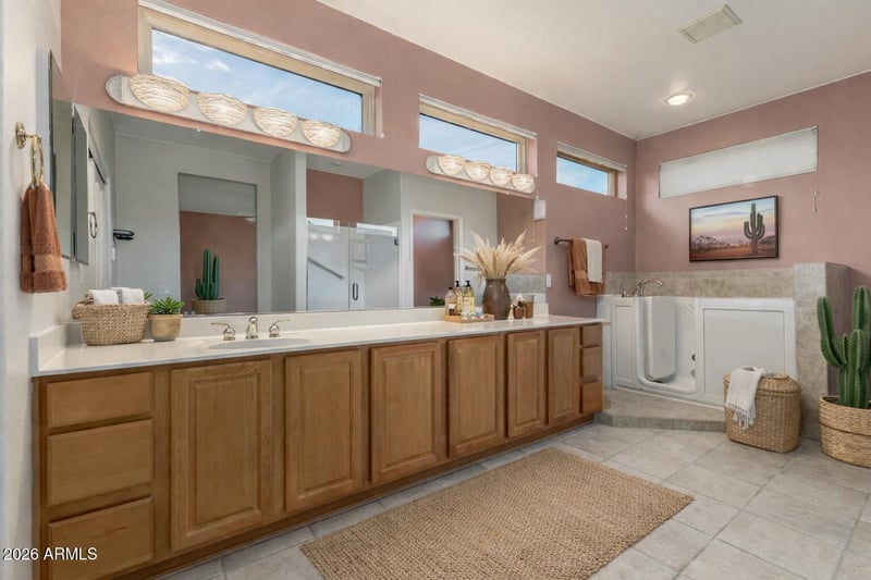 Listing details for 16432 Quarry Ct, Surprise, AZ 85374 : This Jasmine floor plan in Sun City Grand offers double primary bedrooms, 2.5 bathrooms, and timeless charm. Excellent curb appeal with FRESH EXTERIOR PAINT, desert landscaping, a quaint courtyard, and a 2 car garage with built-in cabinets. Inside, enjoy spacious living and dining areas perfect for entertaining, complemented by high ceilings, plantation shutters. The kitchen features ample cabinetry, solid-surface counters, a pantry, built-in appliances and a prep island. Double doors lead to the first primary suite with bay window, spacious closet, and a luxurious bathroom! The cozy den is perfect for an office or reading nook. All of this under a NEWLY REPLACED 2020 ROOF. Out back, relax on the extended covered patio and enjoy the quiet neighborhood. Welcome to the Grand lifestyle! Also including a backyard covered patio and extended seating area w/an attached pergola, this home has it all! Don't miss out!