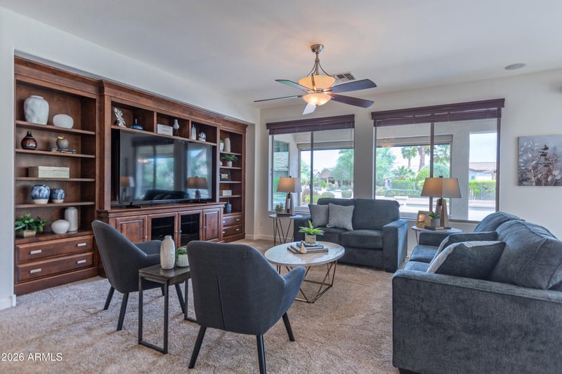 Listing details for 16464 Virginia Ave, Goodyear, AZ 85395 : This home is on a common area lot with a park-like view. Popular Talavera floor plan has an open layout. There is also a private guest casita with its own paved courtyard entrance. The huge kitchen has lots of cabinets, pull-out shelves, granite counters, & walk-in pantry. A custom media center & coffered ceiling add both style & function to the great room. The spacious primary suite has room for a cozy sitting area. The spa-like has two sinks, large walk-in shower, soaking tub, & a huge walk-in closet. The extra-large laundry room includes a storage closet, washer & dryer. Recent updates include Fresh interior paint throughout, including the casita (2026). New front landscaping (2026). New HVAC (2023). New hot water heater (2022). Full 3-car garage with built-in cabinets. Move-in ready!