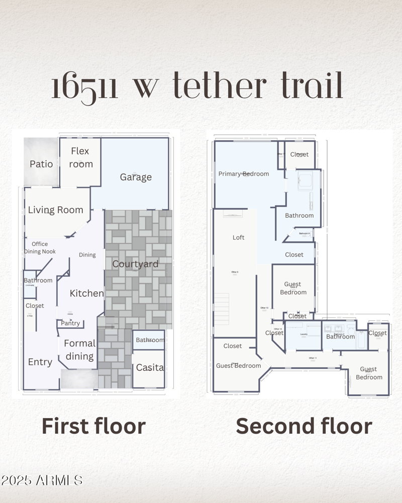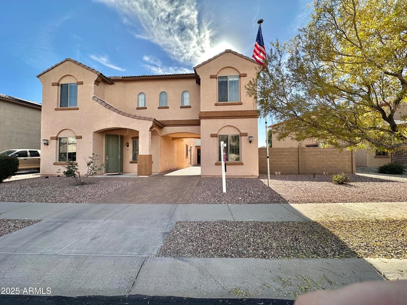 Listing details for 16511 Tether Trl, Surprise, AZ 85387 : CASITA with Full Bathroom Perfect for at home business, Rental or multi-generational living. This spacious Desert Oasis home comes with so much flexibility. Featuring 5 bedrooms, loft, office, formal dining room, and an oversized flex room ideal for a 6th bedroom or entertainment space. Light and airy interior with neutral gray tones throughout. The owner's suite comes with his and hers closets, soaking tub, separate shower and toilet room. Upstairs oversized laundry room. The carport access leads to a rear courtyard with a two-car garage and an expansive side yard allowing for an RV gate, pool, playground, or endless customization all while maintaining a private backyard. Enjoy the mountain views from upstairs, quiet street in this established North Surprise neighborhood.