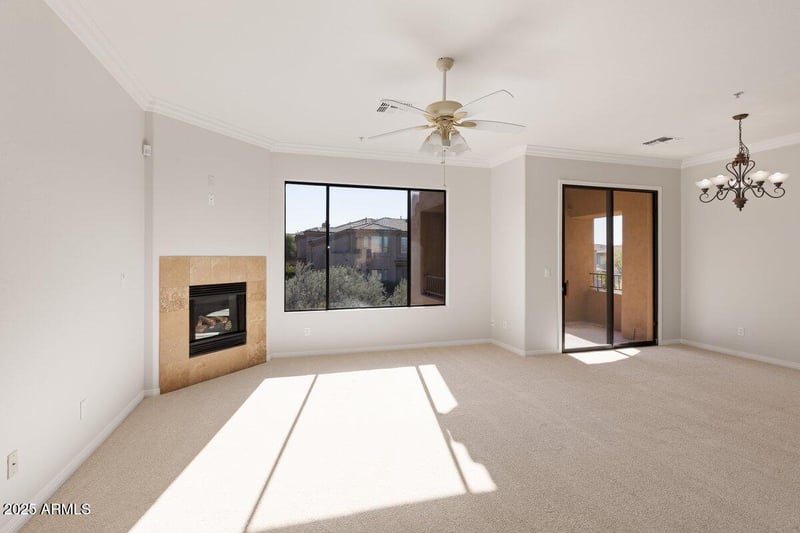 Listing details for 16600 Thompson Peak Pw #2013, Scottsdale, AZ 85260 : Beautifully updated 3 bedroom 2 bath condo in McDowell Mountain Ranch has all new interior paint with contrasting trim and crown moulding. Brand new plush carpeting just installed in this upper level split floorplan. Large kitchen with 42'' upper cabinets has tons of storage, counterspace and gorgeous Volcano granite countertops. Adjacent laundry room has been updated with granite, storage and a large sink. Large primary bedroom suite has granite countertops, a jetted tub and walk-in tiled steam shower. Enjoy morning coffee from your private balcony. Great room with gas fireplace and dining area enjoys south-facing views with covered balcony overlooking the desert wash and mountains and city light views. The community also offers a pool, spa, work out room and rec room and homeowners enjoy the privileges of McDowell Mountain Ranch with lap pool and spas, tennis and pickleball courts, playgrounds and miles of trails. This community is conveniently located next to McDowell Mountain Marketplace - walk to Basha's grocery store, seven different restaurants, vet clinic, UPS store and lots more!