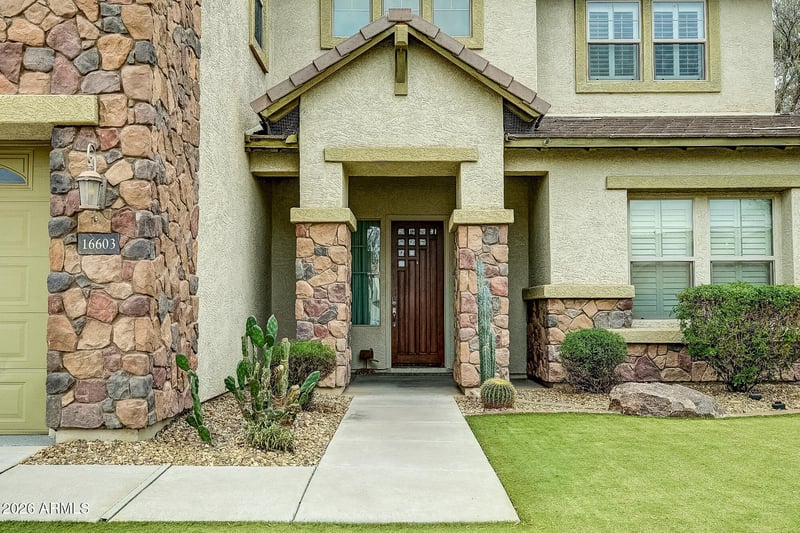 Listing details for 16603 Mesquite St, Goodyear, AZ 85338 : Stunning!! Enter to beautiful wood and tile floors in all the right places. Formal living & dining with soaring ceilings and high windows to bring in the natural light, and yes, plantation shutters. The kitchen, dining and family room is great for entertaining! Eat-in kitchen has an abundance of tiered espresso cabinets, beautiful granite counters, island w/breakfast bar, gas cook top, wall mount double ovens and a walk-in pantry. Master has a full en-suite that includes a split double vanity, soaking tub, separate step-in shower, private toilet room and walk-in closet. And Oh, did I mention the workout room - all equipment include. Check out the resort style backyard with a large covered patio, sparkling pool and a nice artificial grass area. You must check this one out before its gone!