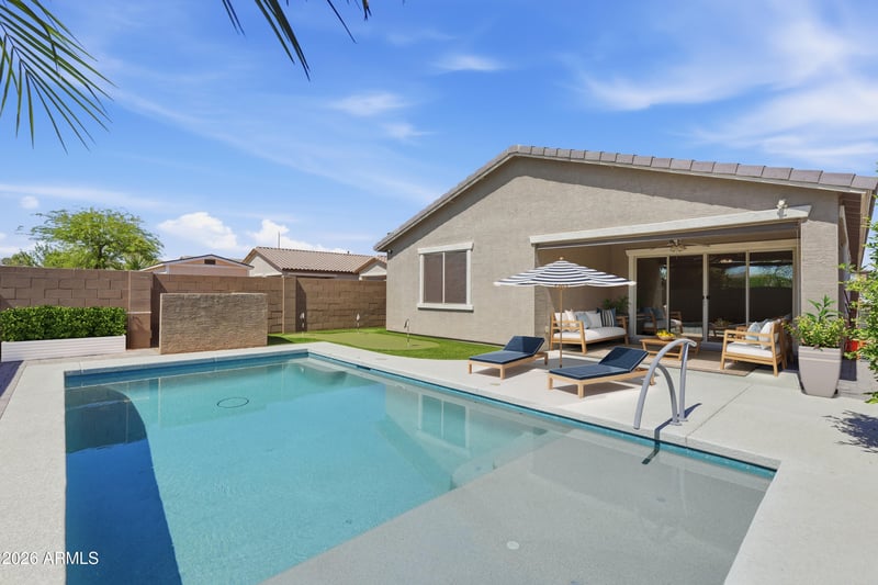 Listing details for 16611 Shangri La Rd, Surprise, AZ 85388 : Welcome to the Retreat at Sycamore Farms. This upgraded 4BR, 2BA home offers 1,839 SF, split floor plan & refined indoor-outdoor living. Lovingly maintained by original owner & lightly lived in, shows exceptional pride of ownership. On a corner lot next to a large green space w/park access & no neighbor behind, it offers quiet, comfort, privacy and room to enjoy. Your family will love the backyard oasis w/heated pool & turf putting green, and will appreciate the covered patio, remote-control sun shades, tinted windows, & sun screens. Inside, enjoy wood-look tile, upgraded carpet, quartz counters, white shaker cabinets, tile backsplash, SS appliances, walk-in pantry, island, RO, owned soft water system. Near schools, 303, and just minutes from the shops and restaurants at Village at Prasada