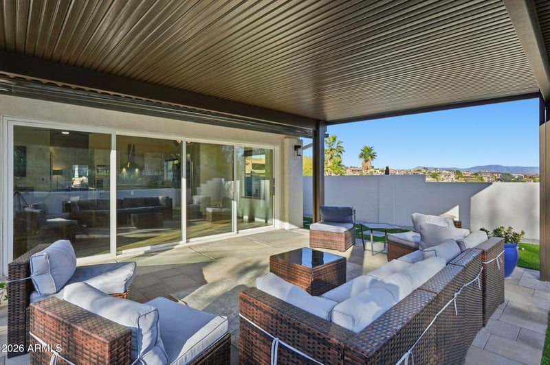 Designed for seamless indoor-outdoor living, floor-to-ceiling glass walls slide open to create a true resort-style experience, effortlessly connecting the contemporary chef's kitchen to the expansive, low-maintenance backyard, updated in 2025 with turf, pavers, a pergola, and fresh landscaping. The spacious layout offers two distinct living areas, dedicated dining space, and a sleek electric fireplace that adds warmth and modern appeal. The expansive primary suite completes the retreat with a generous bedroom and a beautifully updated bath.