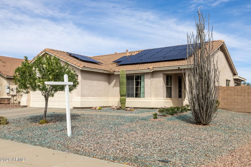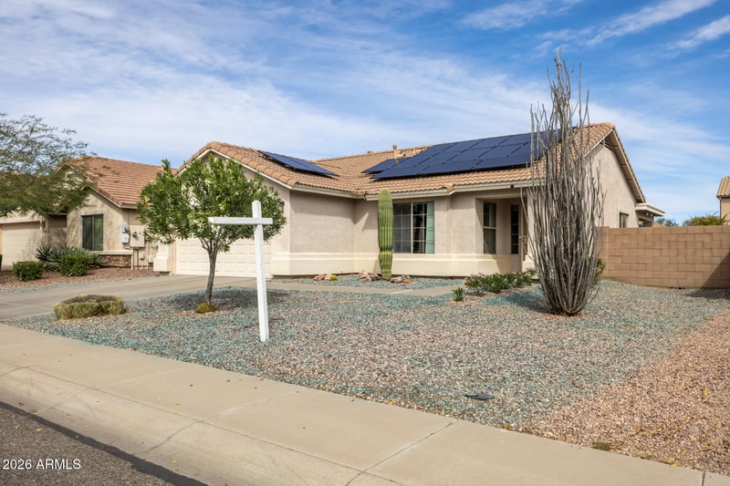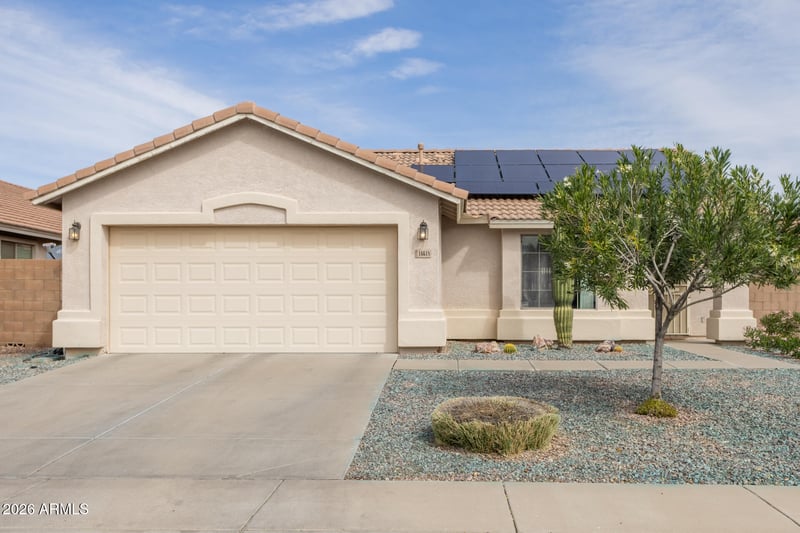 Listing details for 16618 Marconi Ave, Surprise, AZ 85388 : Well proportioned 3 bed 2 bath Northwest Ranch Surprise home. Main common area features a large den eat in kitchen with vaulted ceilings, breakfast bar. Full laundry room with washer and dryer hook. Two nice sized guest bedrooms with side by side closets share hall bath. Ample in size master suite. Master bathroom with dual sinks, separate toilet room, separate stand up shower and garden tub. Mature desert landscaping front & back. Enjoy the benefits of assumable solar system.