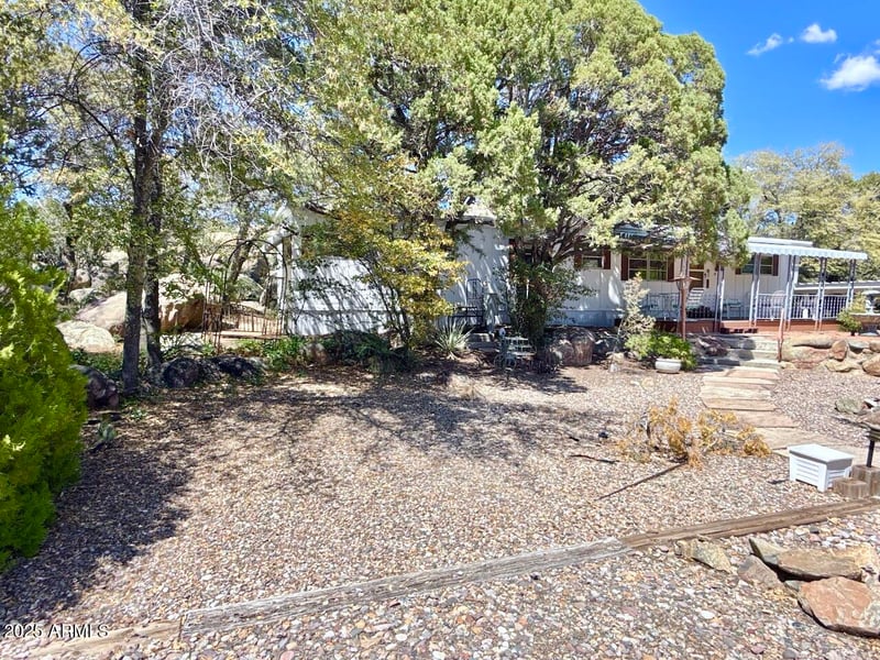 Listing details for 1664 White Oak Cir, Prescott, AZ 86305 : Fantastic covered front porch and private rear deck and patio in a quiet 55+ community. Surrounded by boulder outcroppings, shaded by trees, gravel drive, well maintained, clean and ready move-in condition. Larger parcel, owned lot, 3 parking (one covered); split plan with no interior steps; two generous living areas, updated kitchen cabinets and countertop. Updated cabinets in full guest bathroom located near bedroom. Guest bedroom includes a convenient murphy bed. Primary bedroom includes a built-in closet with drawers, counter with vanity sink and separate toilet and shower. Enjoy a quiet community close to downtown, restaurants, hospital and shopping.
