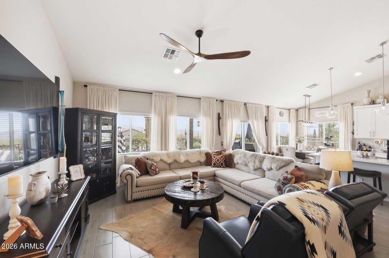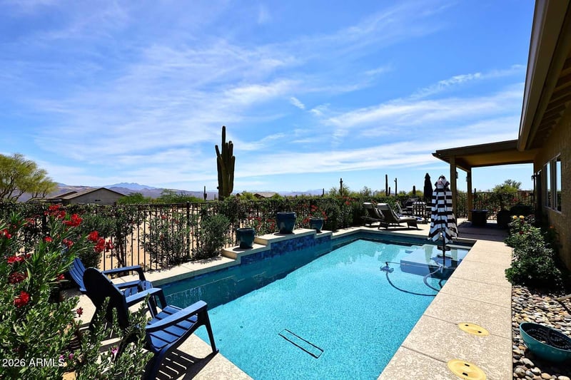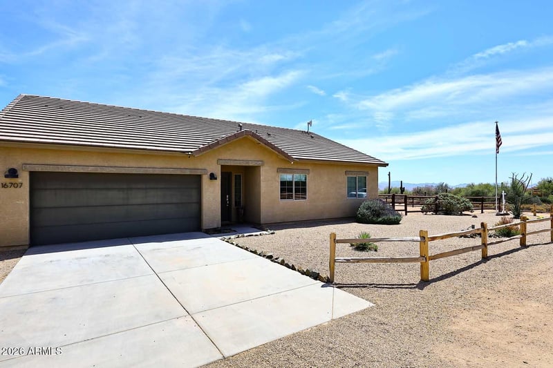 Listing details for 16707 Creosote Dr, Scottsdale, AZ 85262 : Endless mountain views, usable acreage, secured water & no HOA--this is Arizona living at its best. Situated on just under 1.1 fully fenced acres, this 3-bedrm, 2-bath single-family home offers a spacious great room floorplan, a beautifully appointed kitchen w/island and breakfast bar, and a 2-car attached garage. Outside, the property is designed for both enjoyment and function with a horse arena, RV gate, 12x16 Tuff Shed, and an inviting fenced swimming pool surrounded by trees, shrubs & flowering plants. This flat, clean parcel offers open, usable land ready for horses, toys, boats, or whatever your lifestyle requires. Water is secured and registered with Epcor's new facility nearby, along with a 5,000-gallon holding tank with auto-fill meter. Peacefully set back off the main dirt road, this property delivers privacy, flexibility, and unforgettable Four Peaks and McDowell Mountain views.
