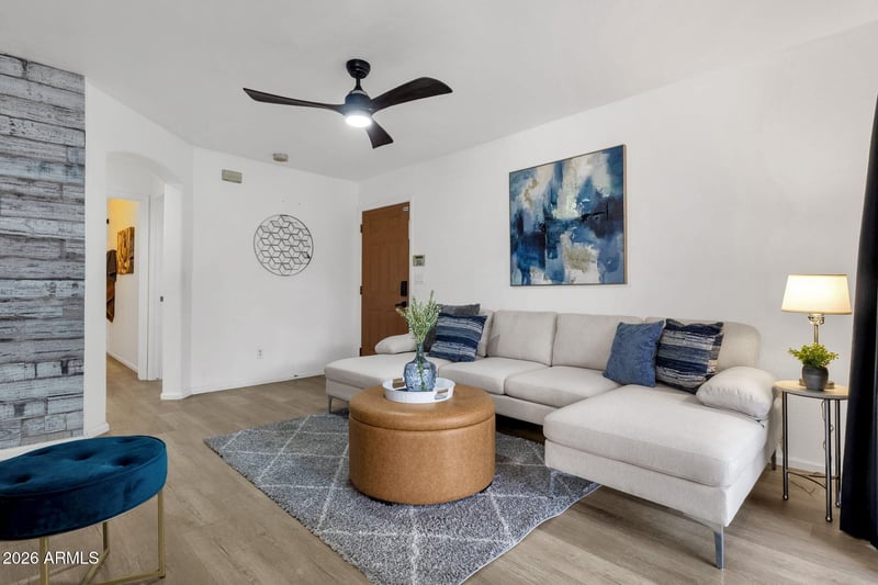 This 2-bedroom, 2-bath home spans approximately 1,100 square feet and features an updated interior with new flooring, granite countertops, and stainless steel appliances. The living area is highlighted by a fireplace and a unique wood plank accent wall that adds character and texture. Ceiling fans with remote controls are installed throughout the home.