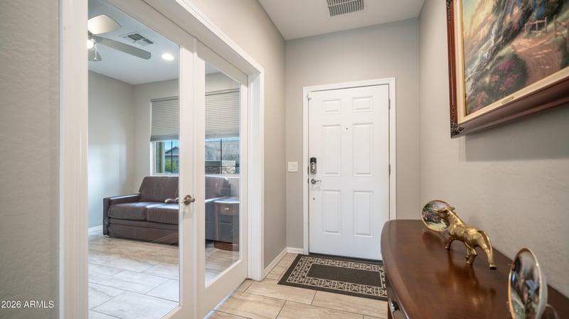 Listing details for 16742 181st Ave, Goodyear, AZ 85338 : This is THE ONE. Welcome to Cantamia, an award-winning, master-planned, gated community offering resort-style living under Arizona's 300+ days of sunshine. Nestled against the stunning Estrella Mountains, this highly upgraded home sits on a premium oversized end lot with panoramic mountain views and a true resort-style backyard. Designed with timeless style and an exceptional open-concept floor plan, the home features a split 2-bedroom layout plus a versatile flex space ideal for an office, den, or 3rd bedroom. High ceilings, abundant natural light, and a neutral palette create an immediate sense of warmth and comfort. The primary suite offers backyard access, dual vanities, a spacious walk-in shower, and a large walk-in closet. The chef's kitchen shines with a large center island, rich espresso cabinetry, granite countertops, elegant tile backsplash, and top-of-the-line stainless steel appliances including a double oven. The backyard is an entertainer's dream with a sparkling PebbleTec heated pool featuring a Baja shelf and waterfall, built-in outdoor kitchen, gas fire pit, oversized covered patio with automatic sunshades, travertine decking, and lush desert landscaping. Every detail impresses, from the custom front entry door and pristine landscaping to the epoxy-floored garage with abundant cabinetry. Enjoy Cantamia's unmatched amenities including lakes, pickleball and tennis courts, fitness center, clubs, classes, and a 29,000-sq-ft Village Center. Your oasis awaits.