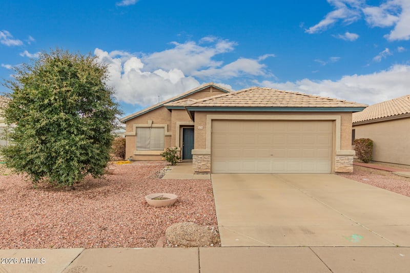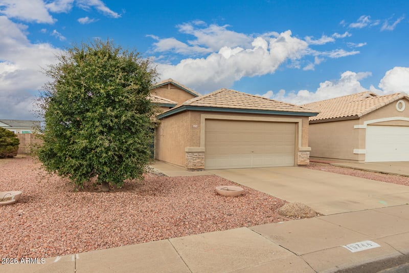 Listing details for 16744 160th Ave, Surprise, AZ 85374 : Look no further! This charming single-level home in Mountain Vista Ranch has it all — including solar panels for energy efficiency! Featuring 3 bedrooms, 2 bathrooms, and a 2-car garage, the home sits on a mature, landscaped lot. Inside, enjoy separate living and family rooms for versatile entertaining. A designer palette and tile floors with soft carpet create an inviting ambiance. The kitchen offers built-in appliances, ample cabinetry with crown molding, and a breakfast bar. The primary bedroom has a walk-in closet and private bath. The spacious backyard includes a covered patio, lush lawn, trees, additional seating area, and storage shed. Don't miss this fantastic opportunity!