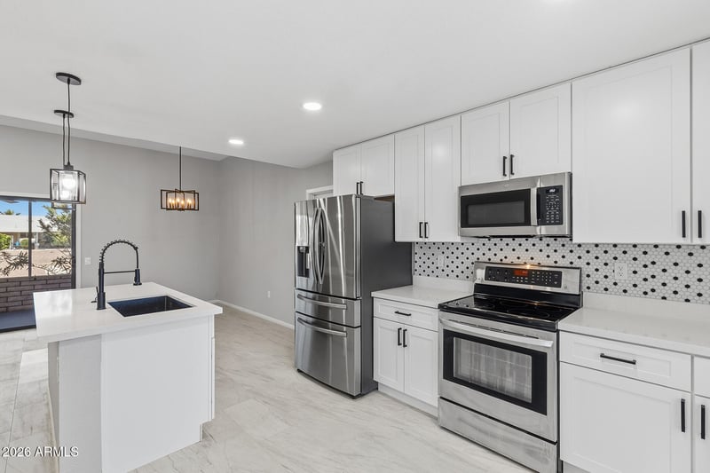 Listing details for 16817 Meadow Park Dr, Sun City, AZ 85351 : Bright & Updated Living! This upgraded home showcases a spacious kitchen with a center island, stainless steel appliances, tile backsplash & white cabinetry accented by sleek black hardware. High ceilings throughout create an open feel filled with abundant natural light, complemented by new tile flooring, plush carpet, & fresh interior paint. The large living area flows seamlessly to a screened-in patio through a glass sliding door. Bathrooms have been thoughtfully updated with unique tile flooring, new vanities & upgraded fixtures. Bedrooms feature comfortable carpet, while the primary suite offers a walk-in closet. The backyard presents a blank slate with room to customize, paired with fresh exterior paint & low-maintenance desert landscaping, plus transferrable leased Tesla solar panel for added efficiency. Situated on a desirable corner lot within a quiet cul-de-sac, this home is located in Sun City with access to community amenities including pools, spa, tennis & pickleball courts, recreation centers & more. Conveniently located near Loop 101 with close proximity to Peoria Sports Complex, Arrowhead Towne Center & a wide variety of dining, shopping, & recreation.