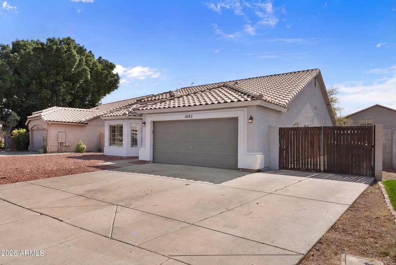 Listing details for 1687 Encinas St, Gilbert, AZ 85233 : Single story beauty in a prime N. Gilbert golf community! This 3BD/2BA, 1,756 sqft home features a tiled interior, spacious master suite w/dual sinks & a rare RV gate w/concrete pad, perfect for all your toys. Open layout is ideal for entertaining & everyday living. Centrally located w/easy access to the 202, US-60, San Tan Village, top rated Gilbert schools, dining, shopping & some of the best golf the East Valley has to offer. Low-maintenance living at its finest. Move-in ready !