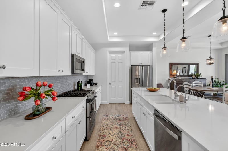 Listing details for 16925 Earll Dr, Goodyear, AZ 85395 : Luxurious ROBSON villa in PebbleCreek, Goodyear, AZ. This 1,730 sq ft masterpiece delivers 2 beds + den, 2.5 baths, and an impeccably modern, high-end aesthetic. Sun-drenched, open layout with soaring ceilings, couture finishes, and a refined soft-neutral palette. Chef-inspired kitchen features 42'' upper cabinets, quartz countertops, designer tile backsplash, soft-close cabinetry, and stainless appliances around a generous island. Primary suite boasts a spa-like ensuite with dual quartz vanities and a grand walk-in glass shower. Private backyard, resort-caliber Pebble Creek amenities, and pristine desert landscaping--luxury living perfected! In addition, this fantastic abode includes a den, a powder room, and a guest suite with its own bathroom. The backyard offers a space for relaxation & leisure, enjoy your favorite beverage under the covered patio, or host delicious barbecues with the built-in grill. This exceptional 55+ community offers resort-style living with amenities ranging from a golf course, pickleball & tennis courts, clubhouse, pool, and much more!! What are you waiting for? Act now!!!