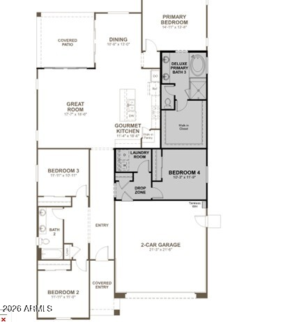 Listing details for 16976 Desert Ln, Goodyear, AZ 85338 : ''Welcome to the Augusta in Portfolio at Lucero ; situated on a hillside, this beautifully designed single-level home offering approximately 2,090 sq. ft., 4 bedrooms, 2 bathrooms, and a 2-car garage. This C Elevation contemporary ranch features great curb appeal with elevated stonework on the façade and clean architectural lines. Inside, the open-concept layout centers around an expansive great room that flows seamlessly into the dining area and gourmet kitchen. The kitchen showcases a large center island, walk-in pantry, maple cabinetry in an almond tone, and sleek matte black hardware, delivering a warm yet modern finish. The private primary suite includes a deluxe bath and spacious walk-in closet, while three additional bedrooms and a shared bath with double sinks provide flexibility. A central laundry room, drop zone, and covered patio complete the home's thoughtful design. Located in the award-winning Estrella community with access to trails, mountain views, and resort-style amenities, this home blends contemporary style with everyday functionality."