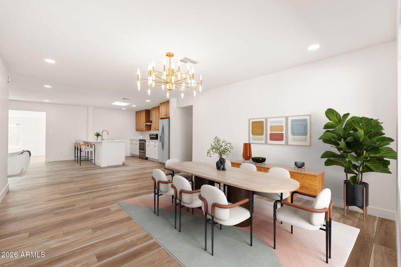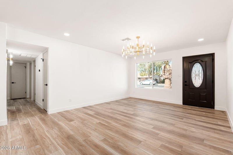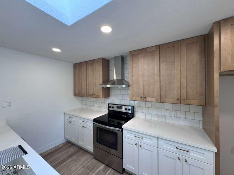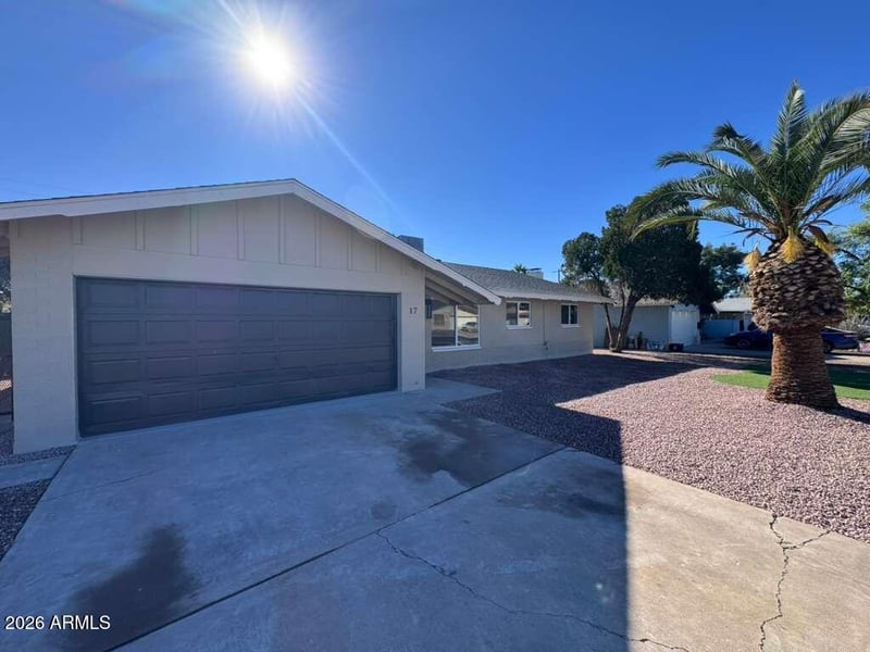 Listing details for 17 Cairo Dr, Tempe, AZ 85282 : Beautifully remodeled single-story home showcasing premium finishes and contemporary design throughout. Major upgrades include a BRAND-NEW Roof, A/C, and Windows. The front yard delivers striking Arizona curb appeal with low-maintenance landscaping, decorative gravel, and a mature palm tree.