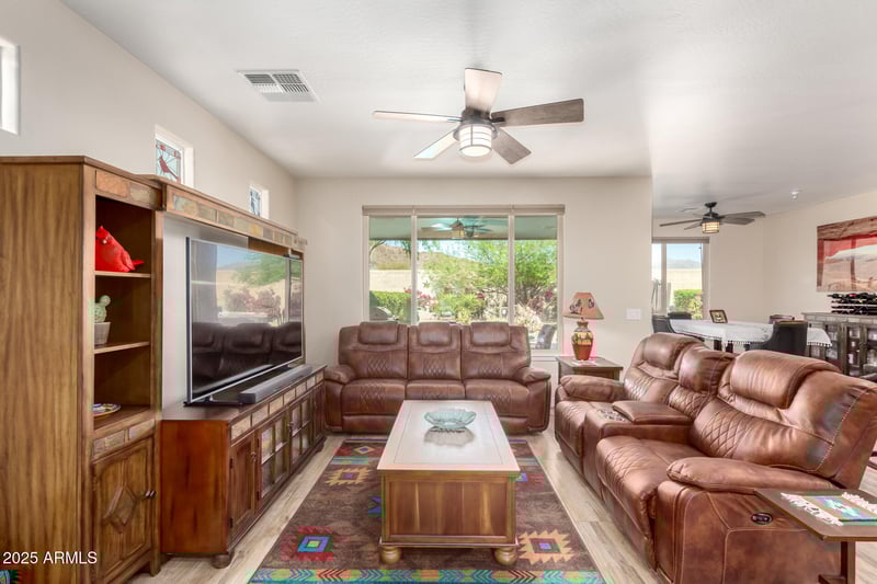 Listing details for 17139 174th Dr, Goodyear, AZ 85338 : Welcome to Your New Home in the Lake-Inspired CantaMia 55+ Community. Prepare to embrace resort-style living in your new home within the CantaMia 55+ community. As you approach your home, you'll be greeted by a beautifully landscaped front yard, and stunning mountain views, with no neighbors behind to disrupt your peace. Upon entering, you'll notice the neutral-toned walls, high ceilings, and generous living space. This 1,418 sqft residence boasts two bedrooms and an office/den, which includes a Murphy bed for accommodating extra guests. Notable upgrades include: OWNED SOLAR SYSTEM, New A/C (2025), Upgraded flooring (2019), Fresh exterior and garage paint, New epoxy flooring (2025), Enhanced baseboards, Vacuflo system, Electric locks, Mechanical interior blinds, remodeled showers, Garage cabinets, and a Whole-house water filter. Bathed in natural light, the interior showcases wood-look flooring that flows throughout the house. The kitchen is equipped with wooden cabinetry, s/s appliances, and granite countertops. Imagine preparing your favorite meals and entertaining around the expansive kitchen island. Designed with a split floor plan, the primary bedroom is located at the back for added privacy and includes an en-suite bathroom with dual sinks, a remodeled walk-in shower and a spacious walk-in closet. Your guests will appreciate the comfort and privacy of the guest bedroom during their stay. Step into your backyard oasis situated on a large lot, where you can unwind with features like a covered patio, travertine pavers, a fire table, a sparkling jacuzzi, and plenty of space for relaxation and entertainment. Imagine sipping a glass of wine in this serene retreat surrounded by soothing water fountains, desert plants and breathtaking mountain views. CantaMia 55+ is not just a neighborhood, it's a community filled with resort-inspired amenities that encourage a genuine sense of camaraderie among neighbors. Enjoy happy hours, live music, various clubs catering to diverse interests, a fitness center, an indoor heated lap pool, an outdoor heated resort pool and the ever popular pickleball, tennis, bocce ball, and an art studio offering classes from pottery to glass fusion. Come vist, fall in love and let's embark on your new journey today!